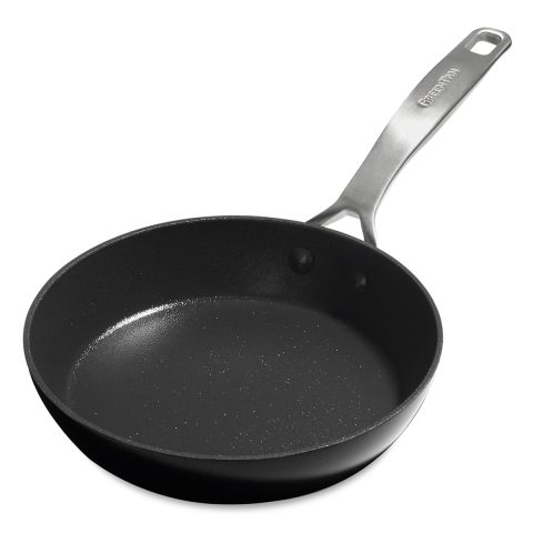 Poêle à frire en aluminium trempé avec revêtement antiadhésif Thermolon TM et manche en acier inoxydable.
