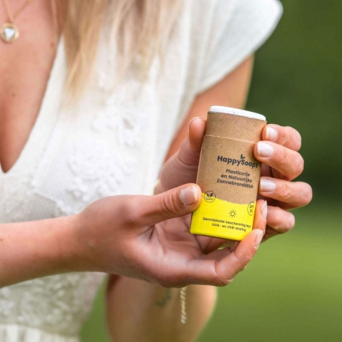 La crème solaire est conditionnée dans un stick en carton. Si vous appuyez sur le fond, vous faites remonter le stick.