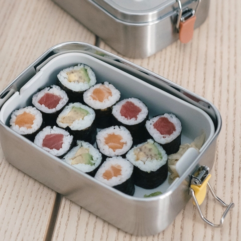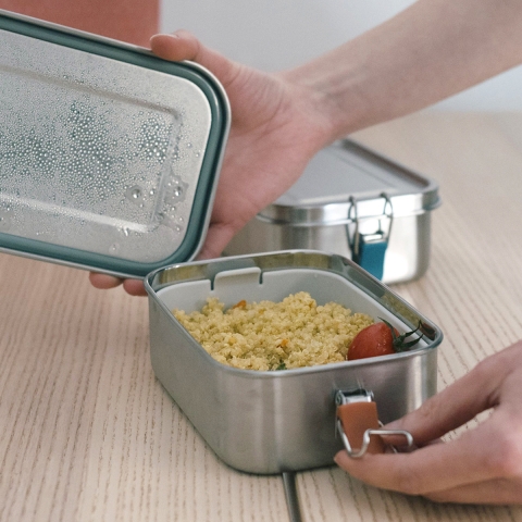 Thermische brooddoos gemaakt van roestvrij staal en voedselveilige silicone. Voedselveilige silicone bevat geen BPA noch ftalaten en voldoet aan de strengste EU-normen.
