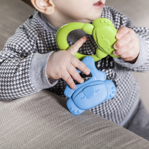 Bijtring gemaakt van bioplastic op basis van hernieuwbare materialen.