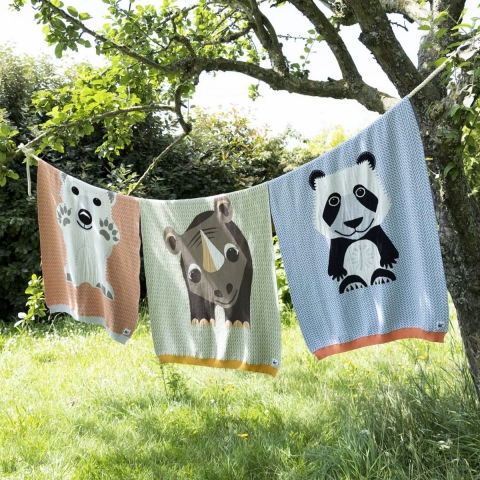 Comfortabel dekentje met leuke dierenprint gemaakt van 100 % gebreid biologisch katoen.