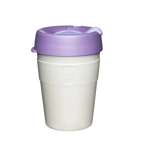 De KeepCup is een stevige herbruikbare, dubbelwandige thermosbeker met hersluitbaar deksel als alternatief voor de wegwerpbeker. In het deksel zit een afsluitbaar drinkgaatje, wat zeer handig is om morsen te voorkomen. Op de foto lijkt het deksel paars maar in wit licht is het eerder zacht lila.