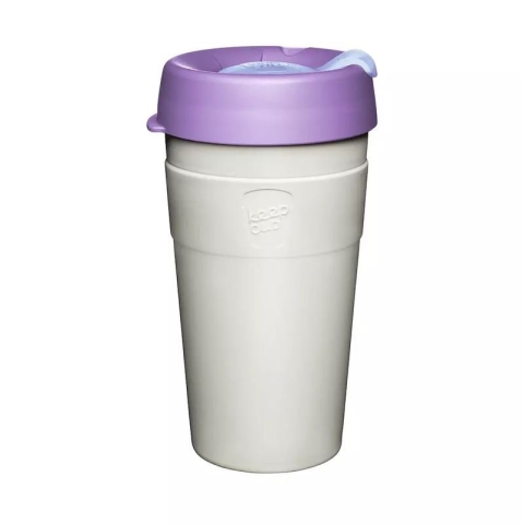 De KeepCup is een stevige herbruikbare, dubbelwandige thermosbeker met hersluitbaar deksel als alternatief voor de wegwerpbeker. In het deksel zit een afsluitbaar drinkgaatje, wat zeer handig is om morsen te voorkomen. Op de foto lijkt het deksel paars maar in wit licht is het eerder zacht lila.
