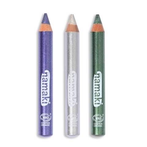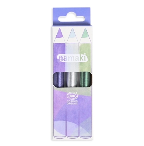 De glitterpotloden van Namaki zijn speciaal gemaakt voor kinderen, met gezonde ingrediënten waaronder biologische jojoba-olie. De make-up is Cosmos Organic gecertificeerd. Deze set van 3 potloden bevatten kleuren in het thema sunshine, met goud, koper en roze.