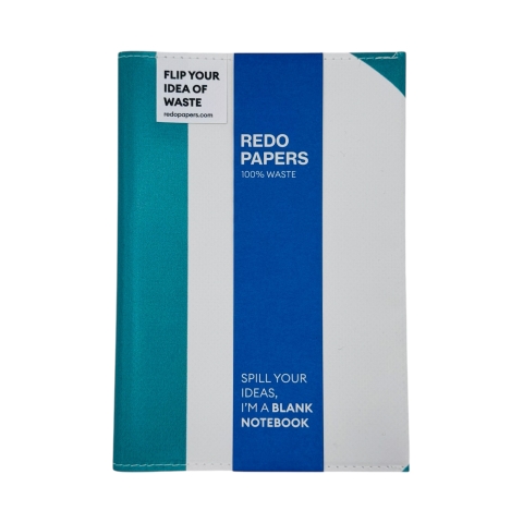 Notitieboek gemaakt van papieroverschotten met cover gemaakt van gerecycleerde reclamebanners.