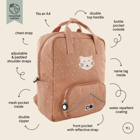 Deze grote rugzak van Trixie is ideaal als schooltas voor de eerste jaren van de lagere school. Er past een A4- formaat in alsook pennenzak, brooddoos en drinkfles. Ook voor onderweg kan deze tas alle spullen voor een dagje onderweg meedragen.