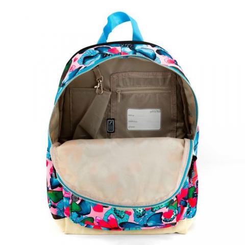 Het rugzakje heeft één hoofdvak. Daarin bevindt zich een klein opbergzakje met naamlabel, het zakje sluit met een rits. Ook is er een elastische flap waar er perfect een drinkfles in past.