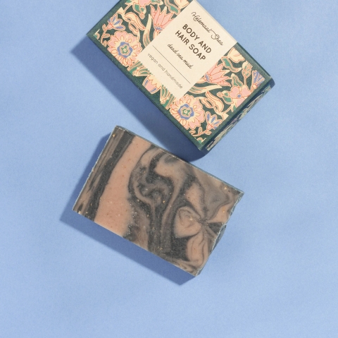 Handgemaakte solide shampoo met modder uit de Dode Zee. De shampoo bar heeft een frisse geur van lavendel, tea tree en cederhout.