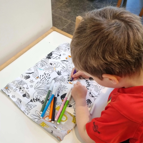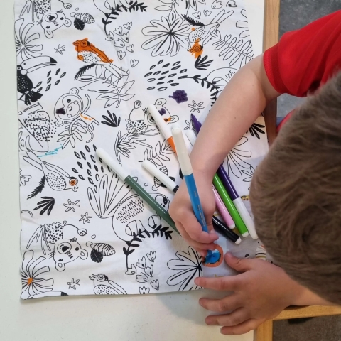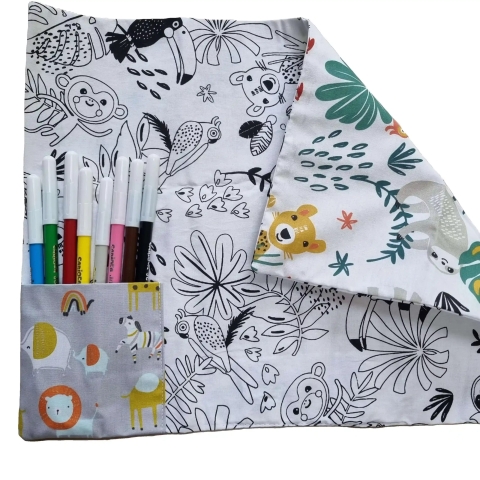 De placemat heeft een ingebouwd opbergvakje om hem op te vouwen en overal mee naartoe te nemen: op restaurant, reis, uitstap, festival, camping... . De placemat wordt geleverd zonder kleuren zodat je zelf viltstiften of waskrijtjes kan toevoegen! Kies voor stiften, krijtjes en kleuren op waterbasis zodat het uitwassen mogelijk blijft.